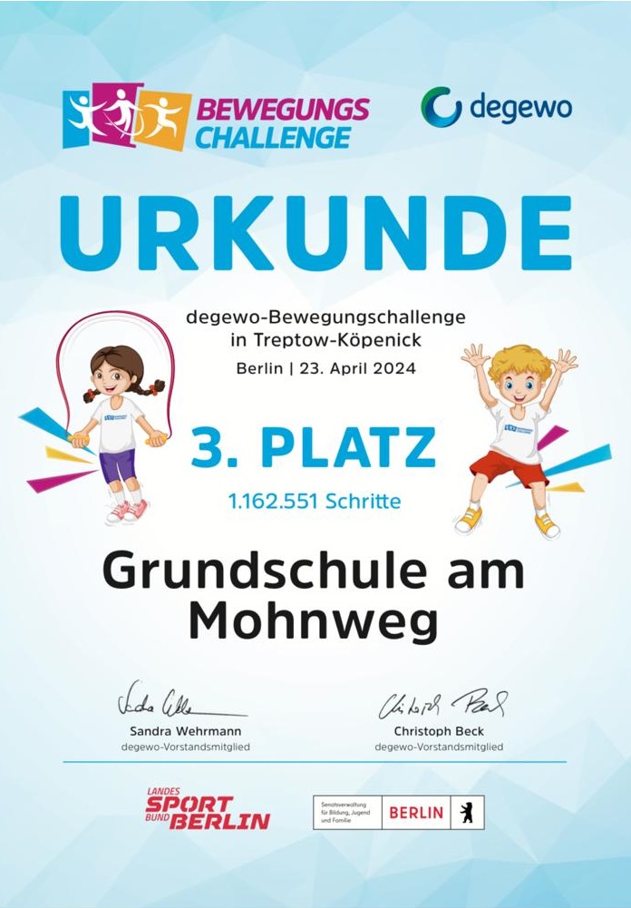 Am 09.04.2024 war es wieder so weit. Unsere Schülerinnen und Schüler aller Klassenstufen haben bei der DEGEWO Bewegungs-Challenge mitgemacht. Es gab 50 Bewegungserfassungsuhren, die ab der 2. Schulstunde ausgeteilt wurden. Damit so viele Schritte wie möglich gesammelt werden konnten, wurden die Uhren regelmäßig unter Bewegung weitergegeben.