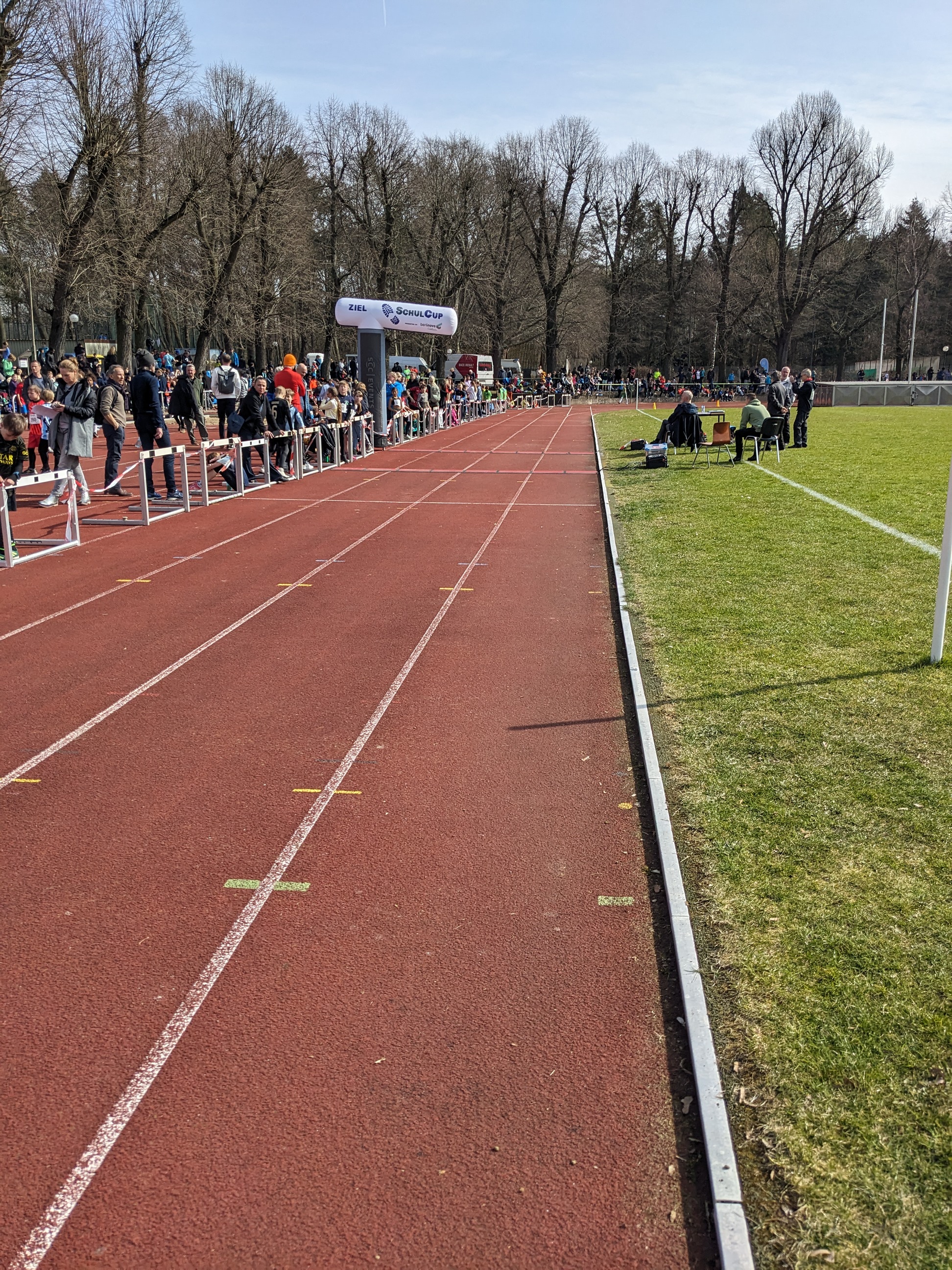 Unsere jüngste Läuferin, und auch einziges Mädchen heute, startete als Erstes. Eine 2,6 km lange Strecke, die durch den Wald führte, hieß es zu bezwingen. Die letzten 300 m führten über die Tartanbahn des Sportplatzes. Dann war der Zieleinlauf in Sichtweite. Mit viel Jubel und Freude empfingen wir dort unsere Sportler und Sportlerinnen. Die gerannten Zeiten können sich sehen lassen (zwischen 10:48,6 Minuten und 13:34,4 Minuten).