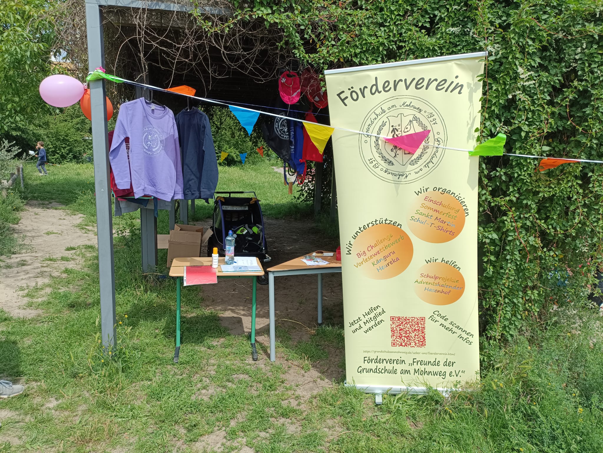Unser Schulförderverein war erstmals mit unserer Schullogo-Kollektion vor Ort. Online kann bereits seit letztem Jahr fleißig bestellt werden (Link zum Schulshop). Beim Sommerfest gab es Kindershirts, -sweatshirts und Hoodies, sowie Sportbeutel und Basecaps zum Sommerfestsonderpreis zu kaufen.